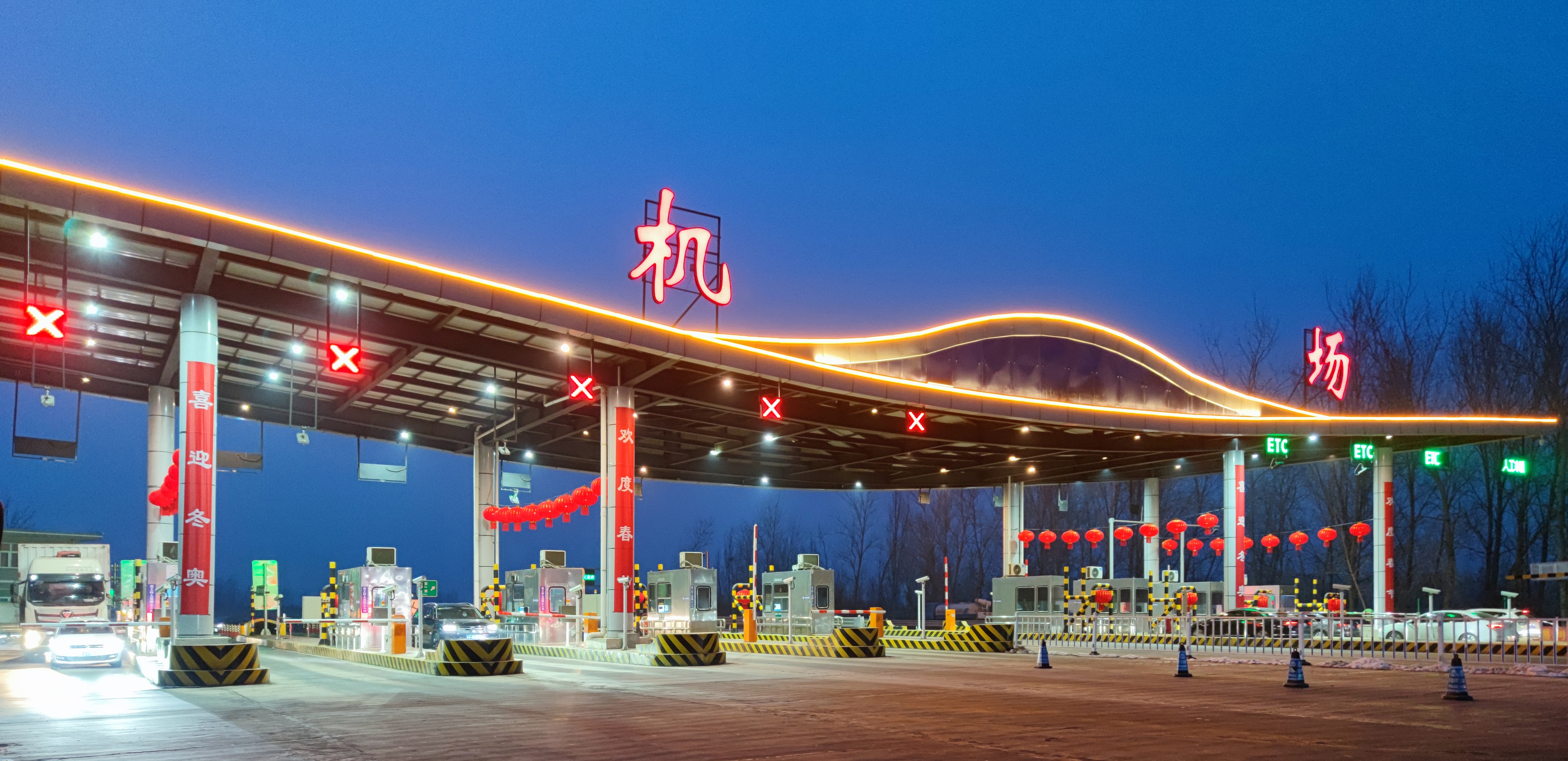 机场收费站以收费广场为主体,在两侧悬挂“欢度春节”“喜迎冬奥”四组朗朗上口的条幅,不仅增添了冬奥会的浓厚氛围,更是表达了广大人民群众对冬奥会的热切期盼。流光溢彩的火红灯笼装饰在收费广场内部,寓意着新一年新气象,传递出浓浓的年味。