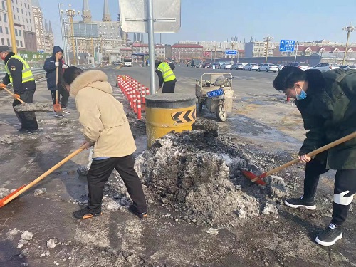 尽管天气严寒,但大家劳动的热情和团结合作的力量没有消退。大家齐心协力,配合默契,铲的铲,推的推,扫的扫,干的热火朝天、不亦乐乎,忙碌的身影形成了一道靓丽的风景线。让这个寒冷的冬天变得格外温暖。