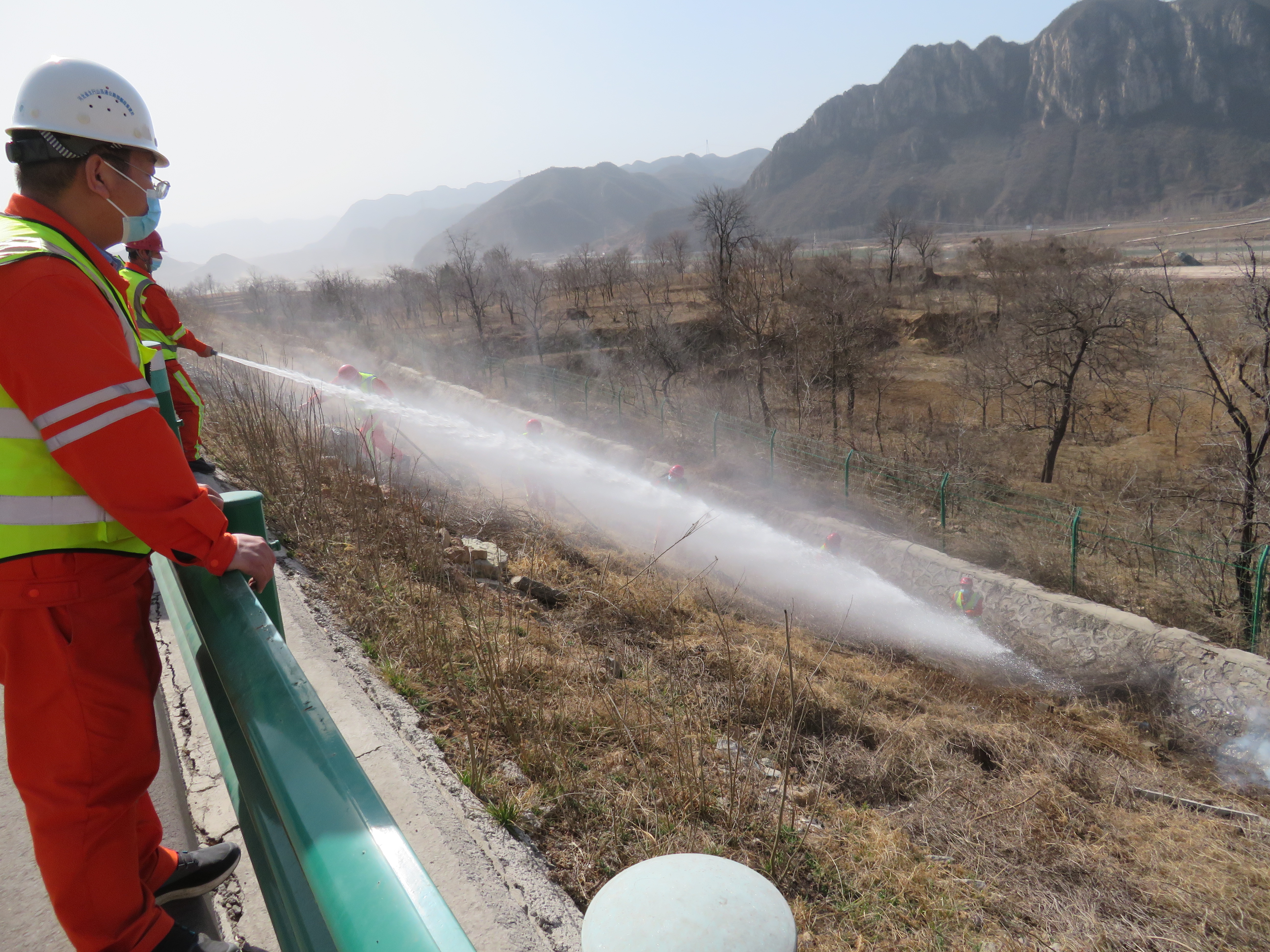 根据现场火势情况,采用洒水车对着火进行直接扑灭,人员在着火边坡相邻边坡进行防火隔离带设置,装载机装载土方进行填铺。待现场火势基本扑灭后,安排作业人员配合洒水车、装载机对剩余零星小火进行彻底扑灭,人工灭火完成后,再次检查是否存在火星,根据路面情况,利用水车冲洗路肩路面,使路面满足通行条件。清理完成后对路面、护栏、通信光缆等设施进行检查。