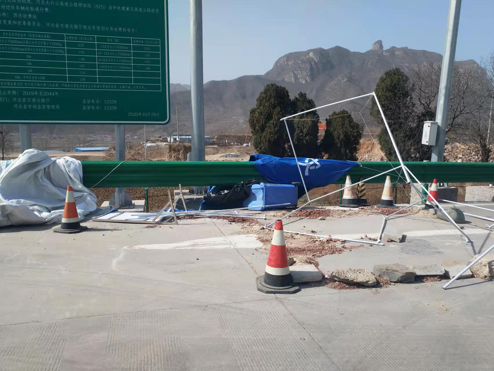 三月四号出现大风恶劣天气,西达收费站广场入口处的临时帐篷(县政府的疫情防控点)被大风吹翻造成了很大的安全隐患,我班成员在收费站领导的指示下快速作出反应,迅速拆除帐篷、清除沙石等路障,保证过往车辆安全畅通。并与相关单位取得联系归还帐篷等物资。