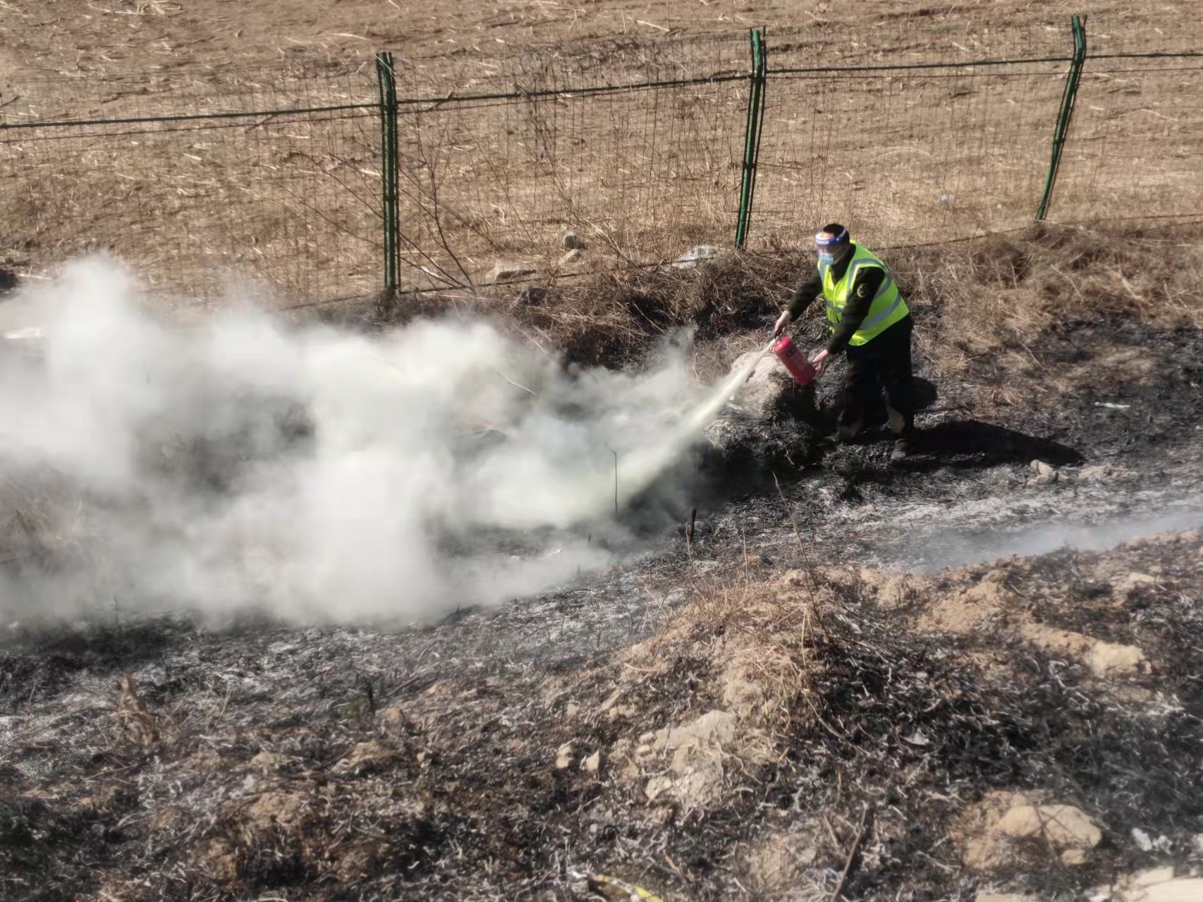 由于植被干枯,且风势较大,现场浓烟弥漫,严重影响行车视线。此时正逢疫情防控检查,车流量大,造成极大的安全隐患。面对险情,现场工作人员分工协作,迅速在事发路段做好安全预警措施,引导过往车辆有序通行,同时利用灭火器奋力扑救,有效遏制火势蔓延。15分钟后,火情得到有效控制,随即明火被扑灭。为避免复燃隐患,工作人员进行了仔细检查,确保了车辆正常通行。