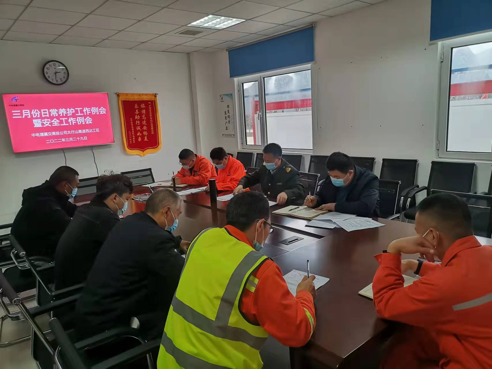 会议传达《关于下达2022全年及1-3月份日常养护计划的通知》(中电建冀交工〔2022〕115号)文件,要求根据工区管养路段实际情况,科学合理安排养护工作,确保病害处治及时,路域环境整洁。