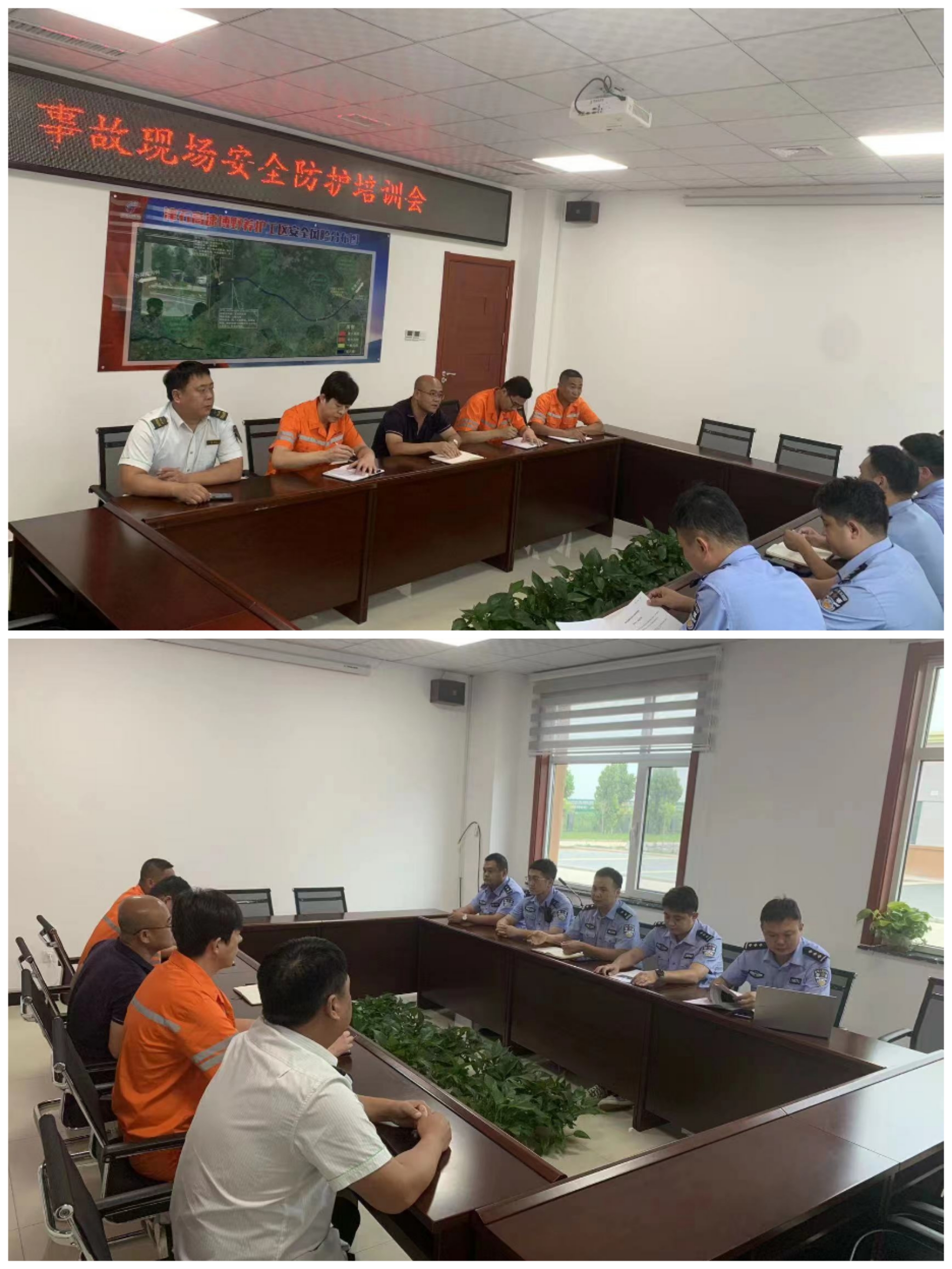 8月13日下午,津石高速运营总监常剑钊,津石高速博野交警大队大队长严国龙,就高速公路发生的安全事故,组织召开施工现场安全防护培训会。
