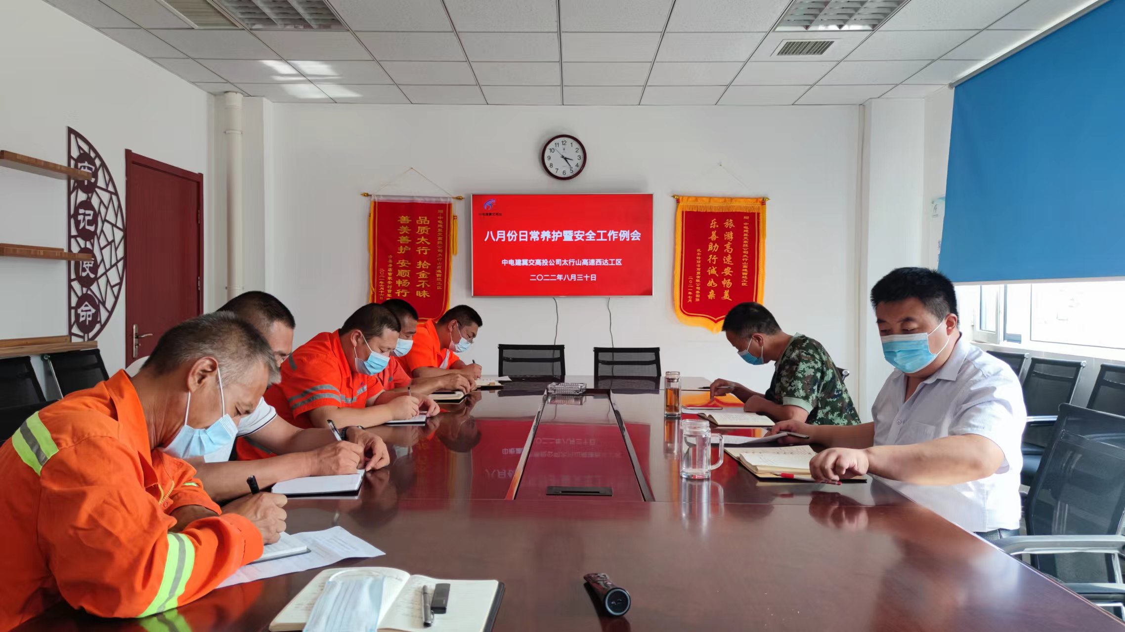 会议传达交投集团《关于进一步加强疫情防控工作的紧急通知》(冀交投应便〔2022〕2号)、公司《关于加强疫情防控工作的紧急通知》(中电建冀交安〔2022〕379号)文件和交通运输厅《关于进一步强化全省公路工程建设项目施工现场疫情防控工作的通知》(冀交传公〔2022〕51号)《关于切实防止新冠肺炎疫情通过交通运输传播的紧急通知》(冀防领办〔2022〕187号)文件,要求全体人员深化思想认识,严格落实文件工作部署要求,进一步增强做好疫情防控工作的责任感和使命感,加强全体人员管理,严格落实方案、指南要求。迅速排查人员是否有高、中风险地区旅居史或亲密接触史的人员,第一时间向公司冀属地疫情防控部门报告,并按要求配合做好隔离观察、核酸检测、健康监测等工作,坚决杜绝发生聚集性疫情。