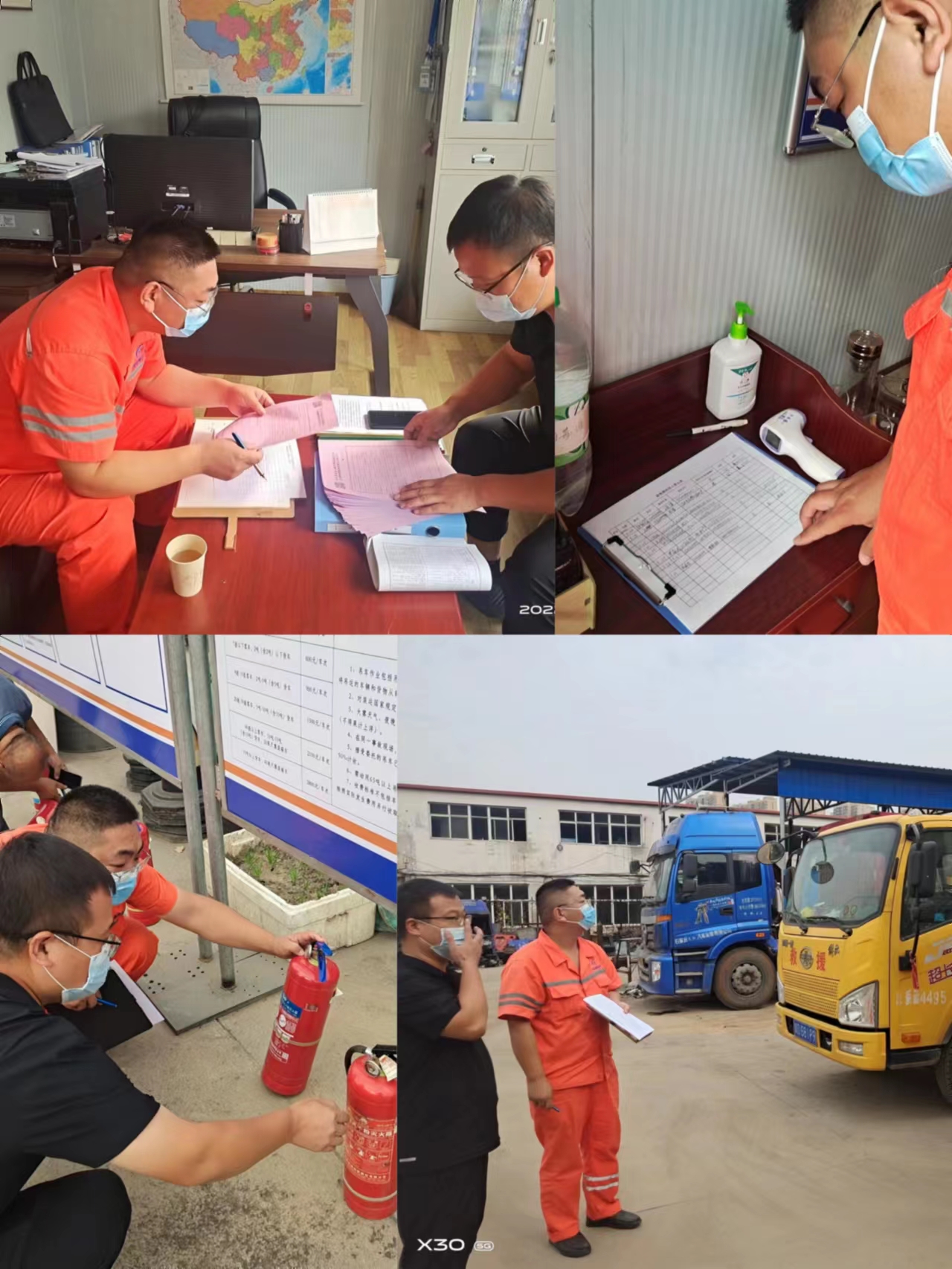 本次检查针对人员保险、安全培训情况、岗前交底、车辆手续和保险、特种作业人员操作证、社会监督卡、救援服务收费明细表、值班备勤制度与执行、事故车辆进出停车场登记、停车场事故车辆及物品保管登记表、消防安全用电、疫情防控、值班备勤等结合日常救援作业进行考核打分。