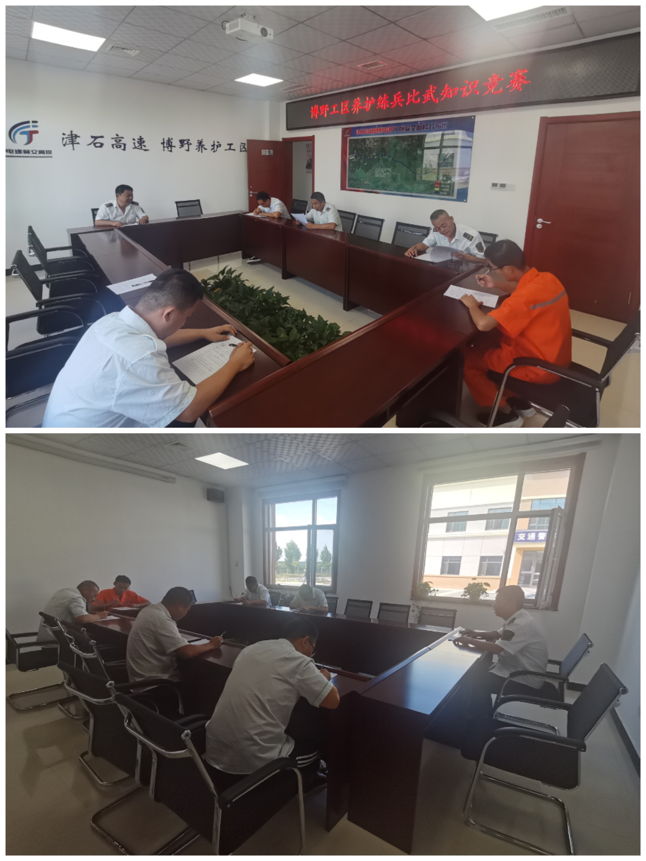 9月15日下午, 博野工区为认真落实公司“大干100天, 喜迎二十大”文件精神,并结合“养护练兵比武”活动进行安排部署,举办养护练兵比武知识竞赛。本次考试采用为试卷的方式进行,工区副主任石绍春进行监考。考试内容包括养护安全作业、养护作业控制区布置、桥梁养护、机械设备管理等内容,通过此次考试,对之前所学内容起到了检验作用,并进一步加深了全员对日常养护作业及安全知识的认识理解。