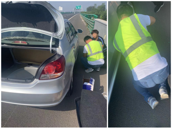 9月16日上午,大城工区巡查人员巡查至津石高速石家庄方向K91+200处,发现一辆轿车因车辆故障,被迫停靠应急车道,急需更换轮胎,因车主换胎技术不熟练,多次未成功,巡查人员发现后,及时上前询问情况,并立即进行事件应急处置,兵分两路,一方面利用巡查皮卡车及随车携带的反光安全锥在车辆后方进行预警,引导过往车辆注意避让,另一方面工区专职司机,利用娴熟技术帮助车主以最快速度换好备胎。待车主驶离现场后,工区巡查人员随即安全撤离现场。