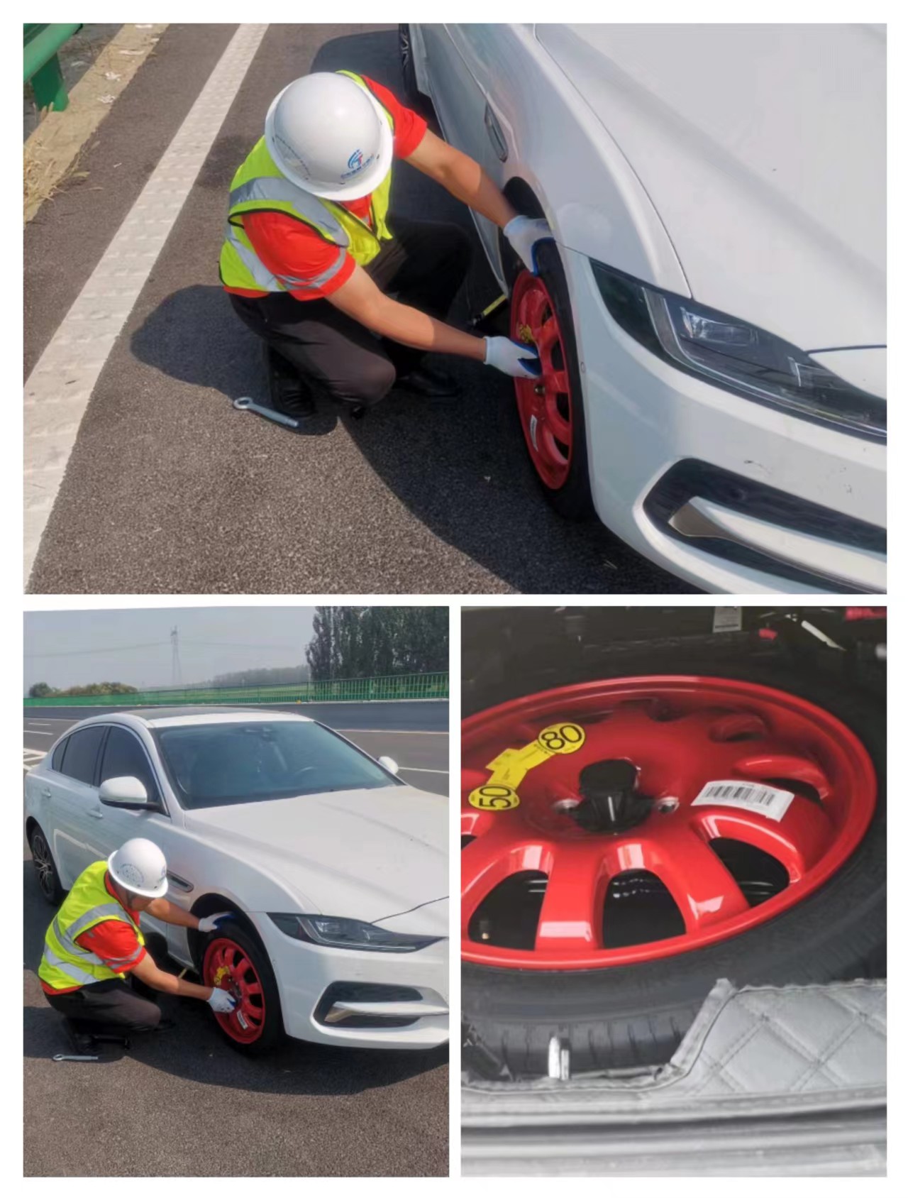9月28日上午,为持续开展“大干100天,喜迎二十大”及路域环境治理各项工作,津石高速高阳工区巡查人员金雷、赵亭旭正在进行路域隔离栅缺失专项排查作业。途径石家庄方向K187停车港湾处,发现一辆白色小轿车开着危险警报灯(双闪),车主蹲在旁边像是遇到什么困难的样子,随即上前询问情况,经询问,该车主是附近企业的职工,近日未曾去过外地,谁曾想,在今日外出办事途中车胎突然爆胎,被迫停靠应急车道,虽然车上有千斤顶和备胎,但自己并不知道该如何操作,多次尝试无果,非常焦急。
