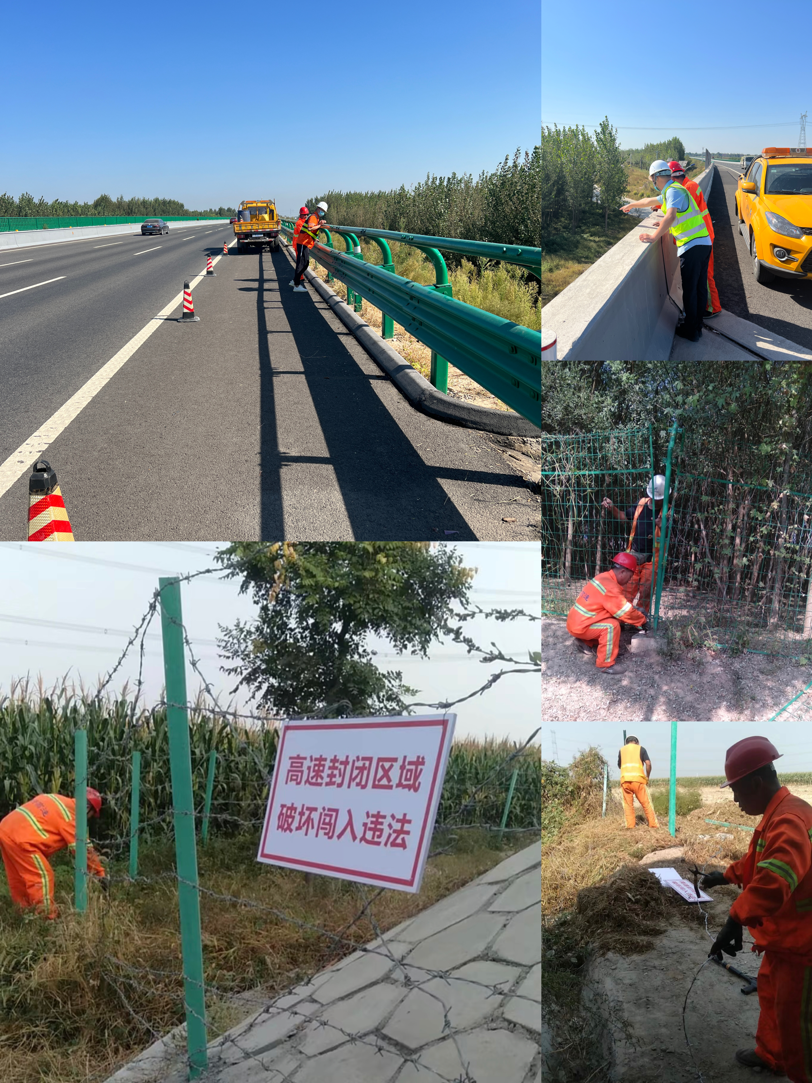 工作中,一是全面排查,限时修复,工区对管养路段进行地毯式排查,全面掌握隔离栅缺失、损坏情况,并及时制定治理方案,明确修复时限,完善交通安全设施,全力消除安全隐患;二是结合行人频繁闯入高速的路段,安装警示牌,提示高速公路为封闭区域禁止闯入。三是通过对隔离栅的及时修复和警示牌的作用,能有效对高速起到重要的防护作用,确保高速公路安全通畅。