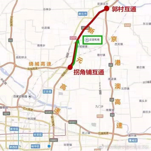 为尽快改善区域通行条件,特别是解决石家庄往返机场需绕行的不便,参建单位科学优化施工方案,全力加快施工进度,历时13个月,主线较原计划提前100天完工通车。机场站和正定高新区站同期开通,新乐站按计划有序推进,力争早日开通。由南向北去往新乐市的车辆,需就近从机场站下道,经107国道到达新乐市;由北向南可由机场站下道沿107国道绕行折返至新乐市区,也可以不驶入新元高速,继续沿京港澳高速南行至新乐东收费站,下站进入新乐市区。