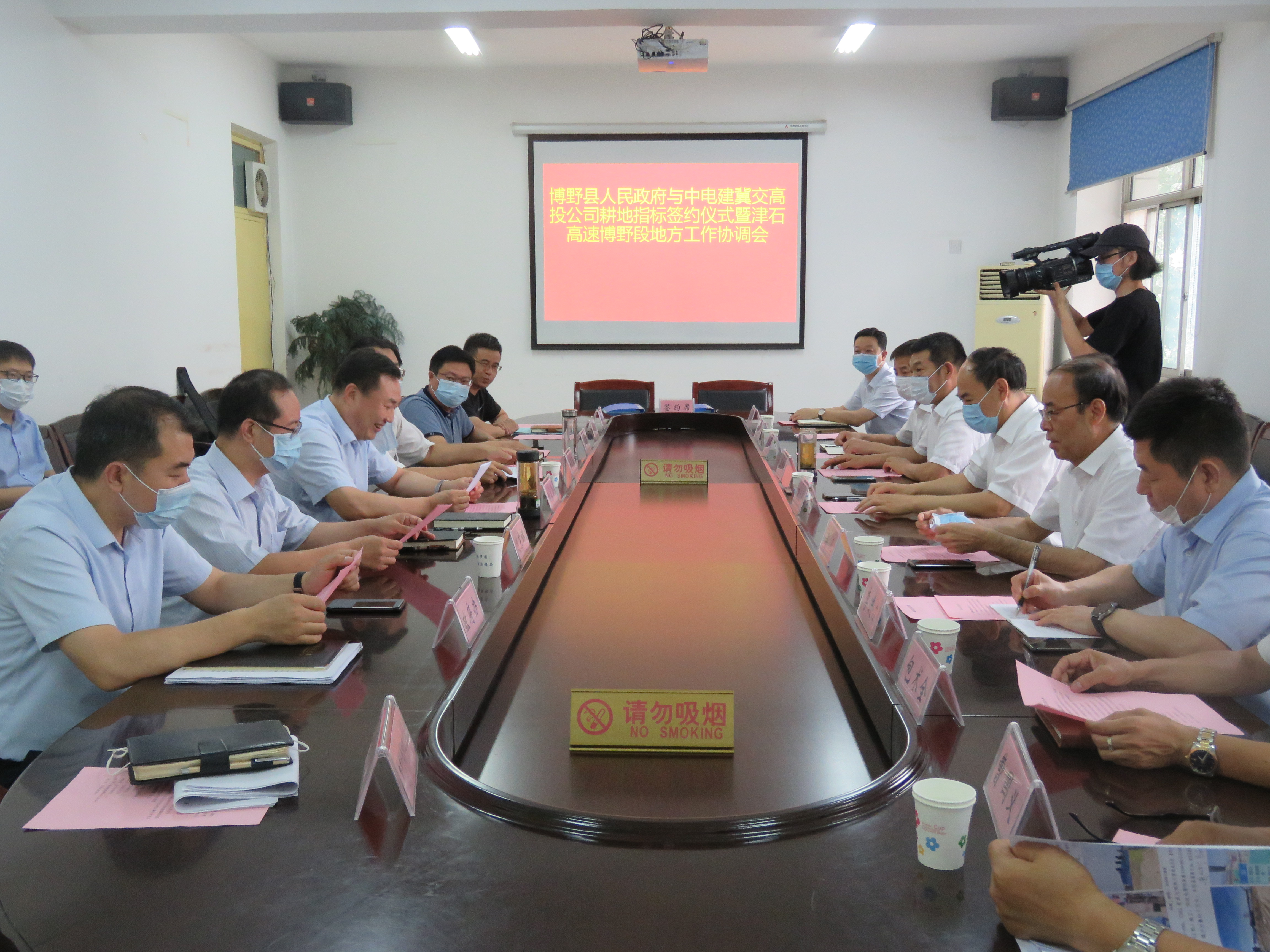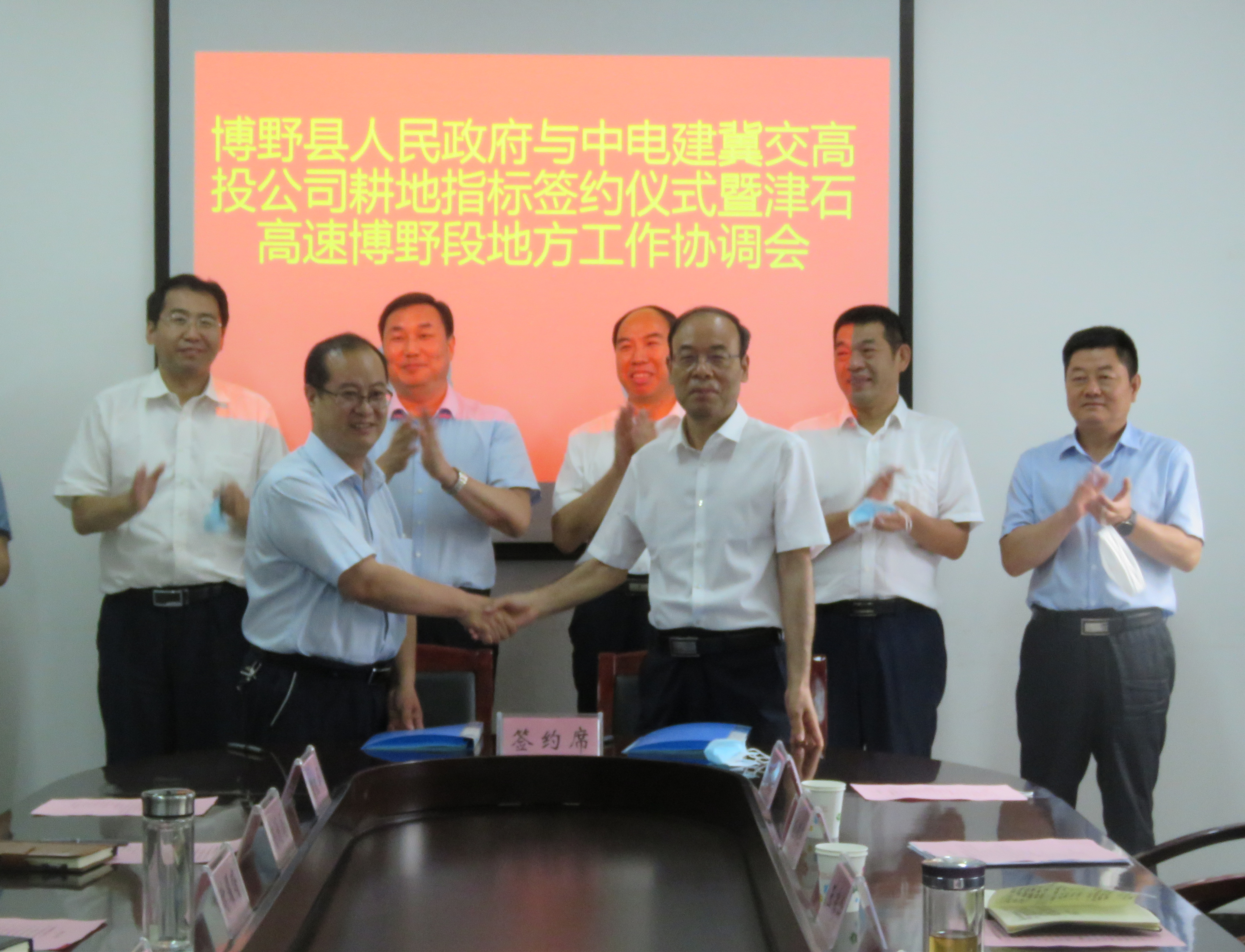 6月22日下午,博野县人民政府就落实补充耕地指标用于高速公路建设项目使用与中电建冀交高速公路投资发展有限公司达成一致意见。下午4时30分,在博野县人民政府常务会议室举行签约仪式,中电建冀交高速公路投资发展有限公司党委书记、总经理唐兰军,博野县县长刘永泽出席了仪式,中电建冀交高速公路投资发展有限公司副总经理李凡与博野县人民政府副县长赵东辉正式签署了补充耕地指标协议。双方还就当前剩余地方工作进行了深入交流,同时就重点征拆难点提出了新思路和建设性方案。
