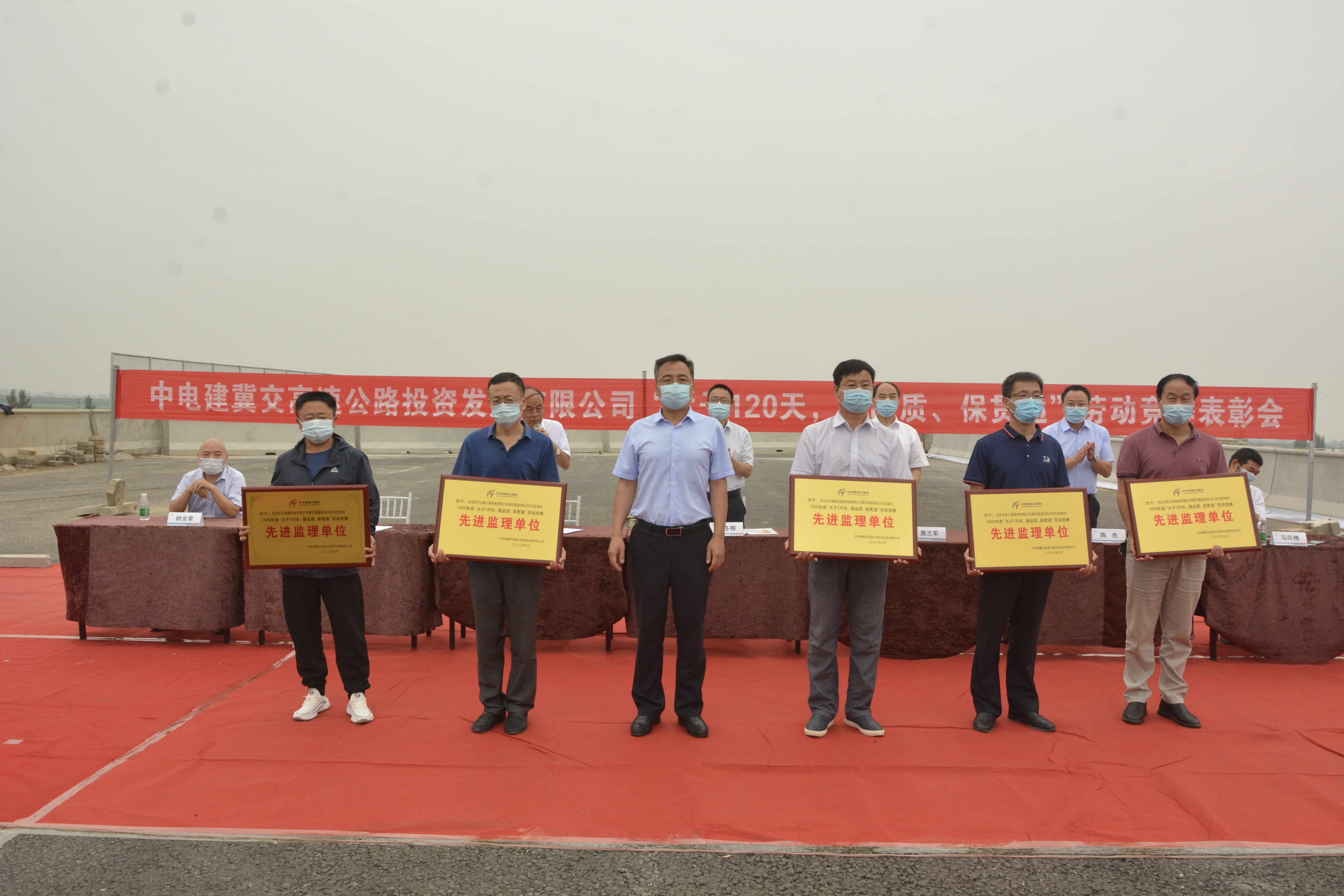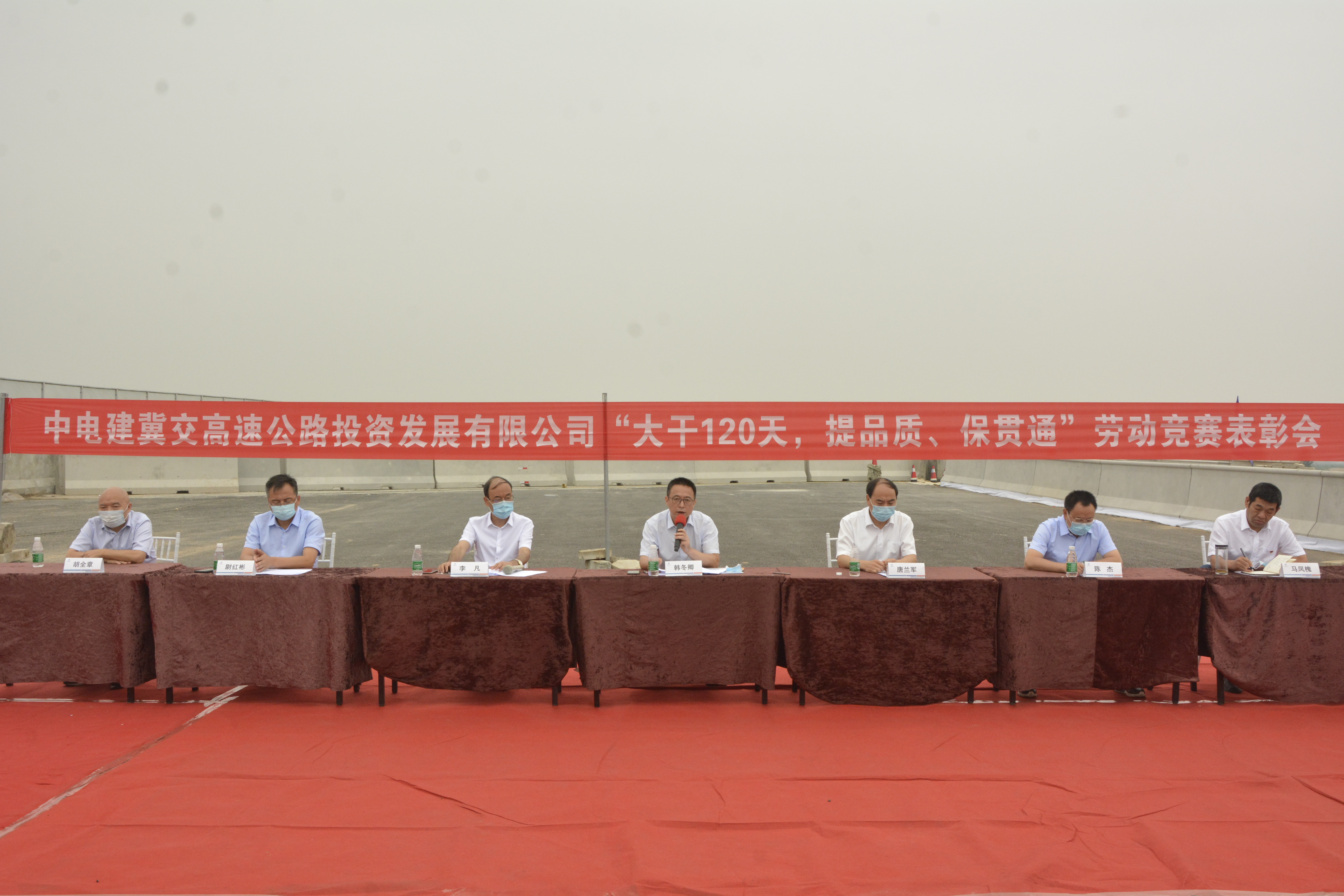 “大干120天,提品质、保贯通”劳动竞赛表彰会。会议宣读了《关于“大干120天,提品质、保贯通”劳动竞赛考核情况的通报》、《关于表彰“大干120天,提品质、保贯通”劳动竞赛先进集体和先进个人的决定》,并对劳动竞赛阶段先进集体和先进个人进行了表彰。中电建冀交高速公路投资发展有限公司副董事长韩冬卿、总经理唐兰军、副总经理李凡、副总经理尉红彬、副总经理陈杰、总工程师胡全章,津石筹建处处长马凤槐出席了会议。