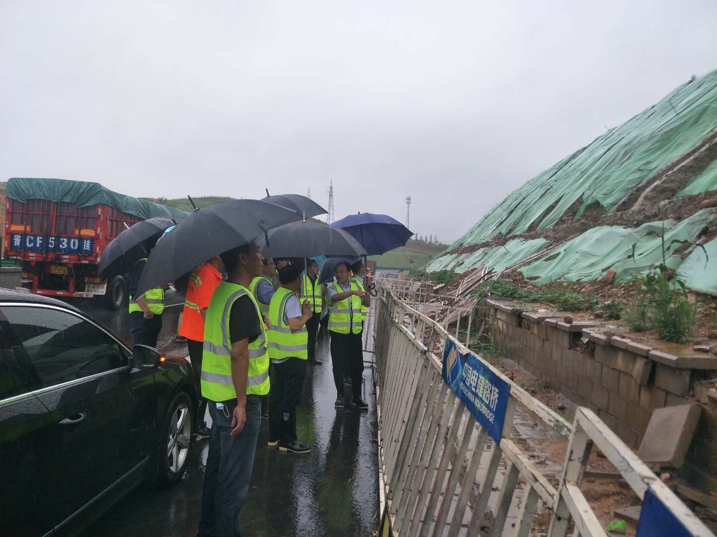 8月6日,河北交投集团公司副总经理赵文忠、安全管理部主要负责人陈复胜一行冒雨到中电建冀交高投公司太行山高速邢邯段督导检查防汛工作。中电建冀交高投公司公司副董事长韩冬卿,副总经理、安全总监尉红彬及相关负责人陪同检查。