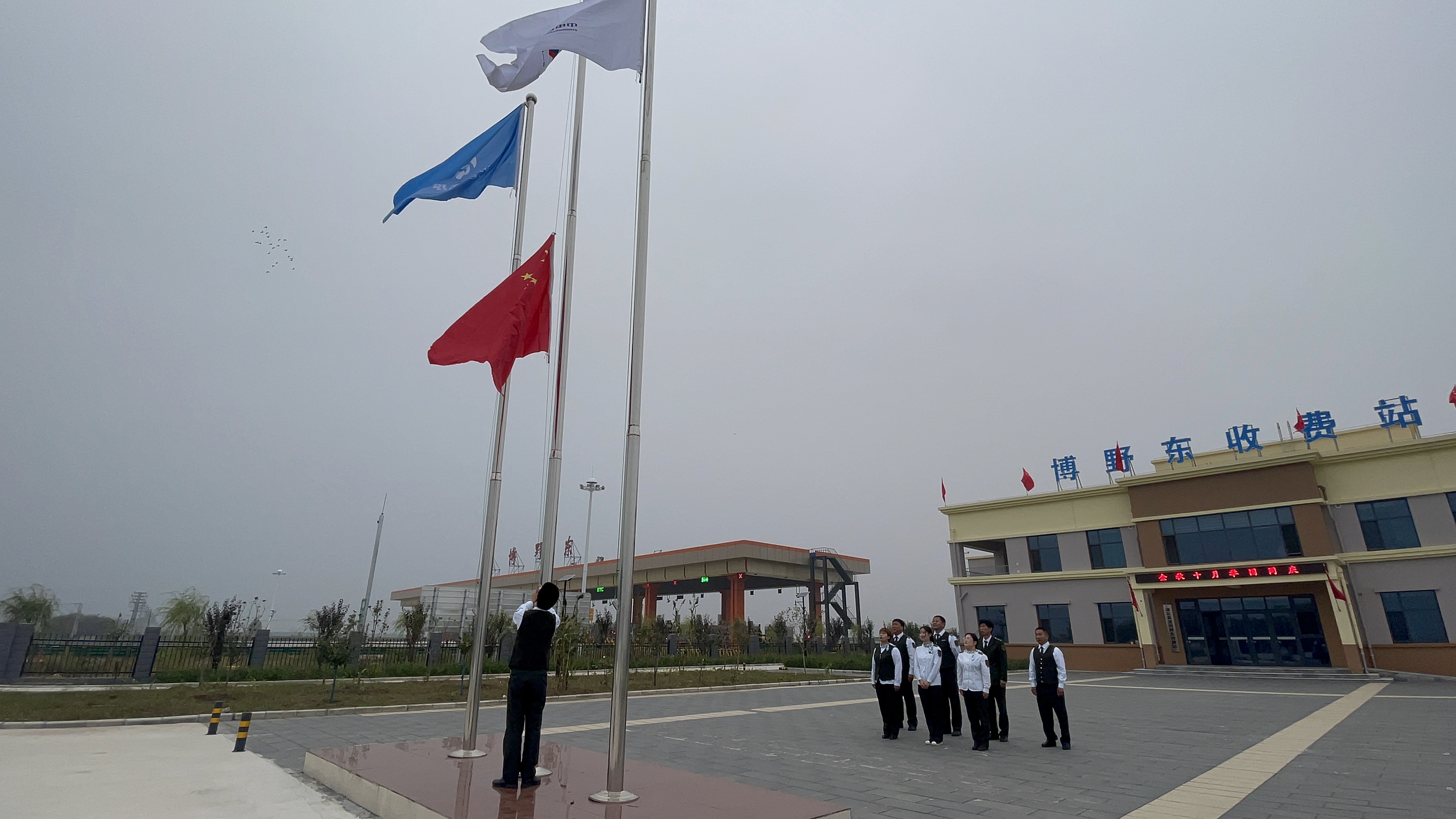 博野东收费站国旗昂扬,营造了浓厚的节日氛围,十一期间是每年的出行高峰,路段车流量明显增多,为树立津石高速良好的窗口形象,我站为司乘人员打造了舒适、便携、温馨、安全、畅通的通行环境。
