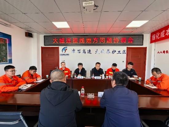 为全面落实公司“降本增效2026”活动要求,3月31日,津石管理中心主任助理盛敬亮、工程养护部经理胡兰强一行,联合大城县交通局副局长王学智,在大城工区组织召开地方问题协调会,工区负责人及全体工程师参会,共同商讨大城地方连接线病害处治与安全保畅优化方案。